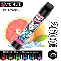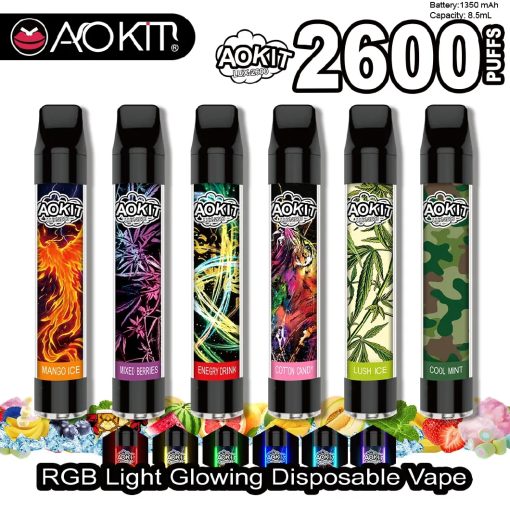 the Aokit Lux 2600 is a RGB light Glowing disposable vape, it is a 5 colors led glowing vapes with 1300mah battery, it support about 2600 puffs and eliquid contains 8.5ml with 5% nicotine.